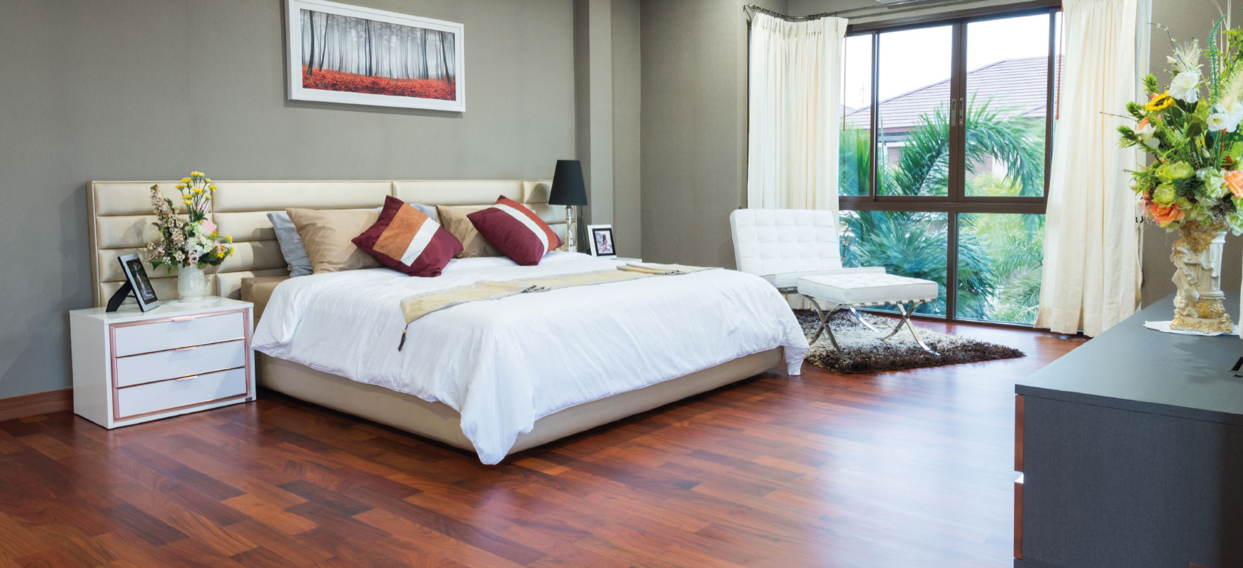 Superficie: Parquet in essenza “Doussiè” 10 mm collezione “Essenze”, supportato 2 strati con multistrato da 6 e 7 mm in betulla, leggermente spazzolato e verniciato UV