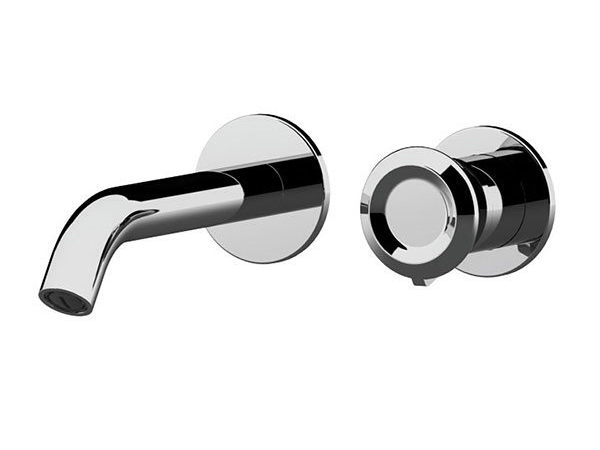 Miscelatore monocomando a incasso per lavabo, su due piastre tonde separate. Lunghezza bocca 17 cm.