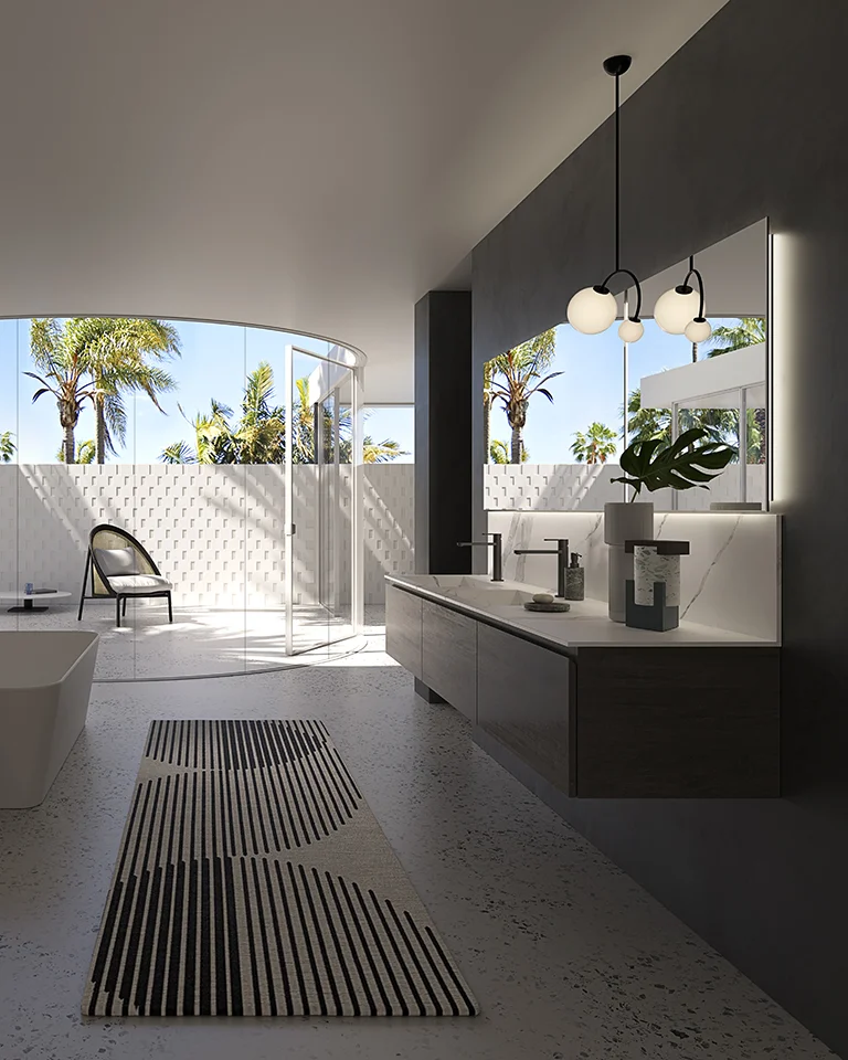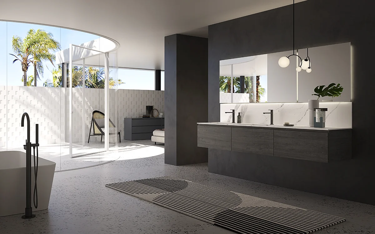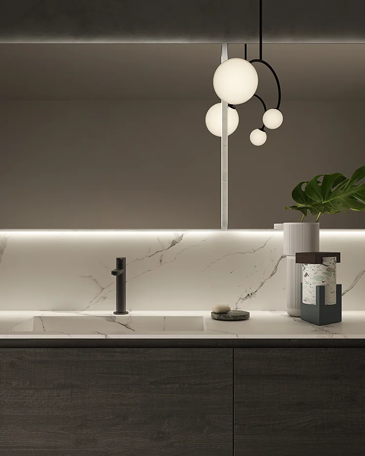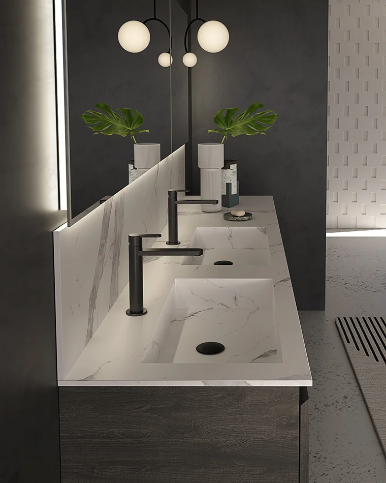 Componibile da bagno sospeso cm 180 con tre ante Nobilitato Quercia Grigia più elegante Top con doppia vasca integrata in gres Statuario Venato abbinato ad alzatina più doppio specchio Modello Elettra retroilluminato con profilo in alluminio.