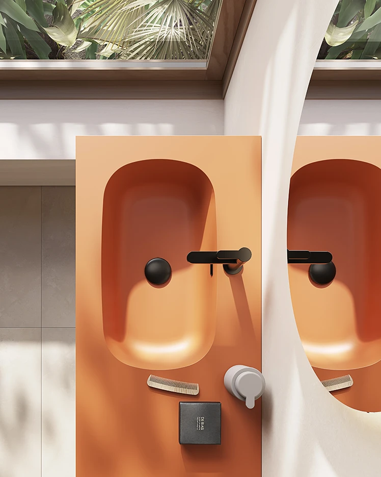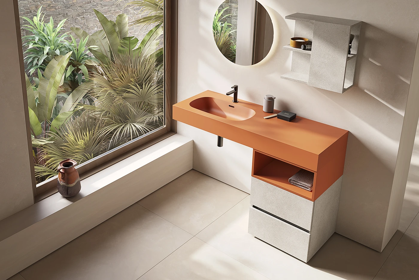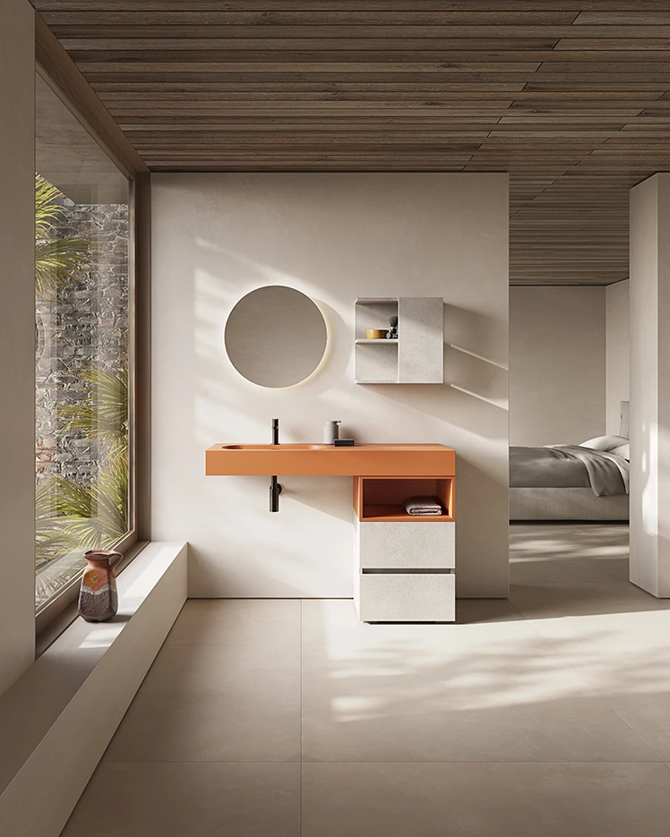 Componibile da bagno con base a terra con doppio cassetto Nobilitato finitura Rio Grande più vano a giorno con nuovo Top Bent scatolato con vasca integrata per Lavabo laccato Mandarino Opaco più specchio Modello Giotto tondo a Led retroilluminato più pensile a giorno