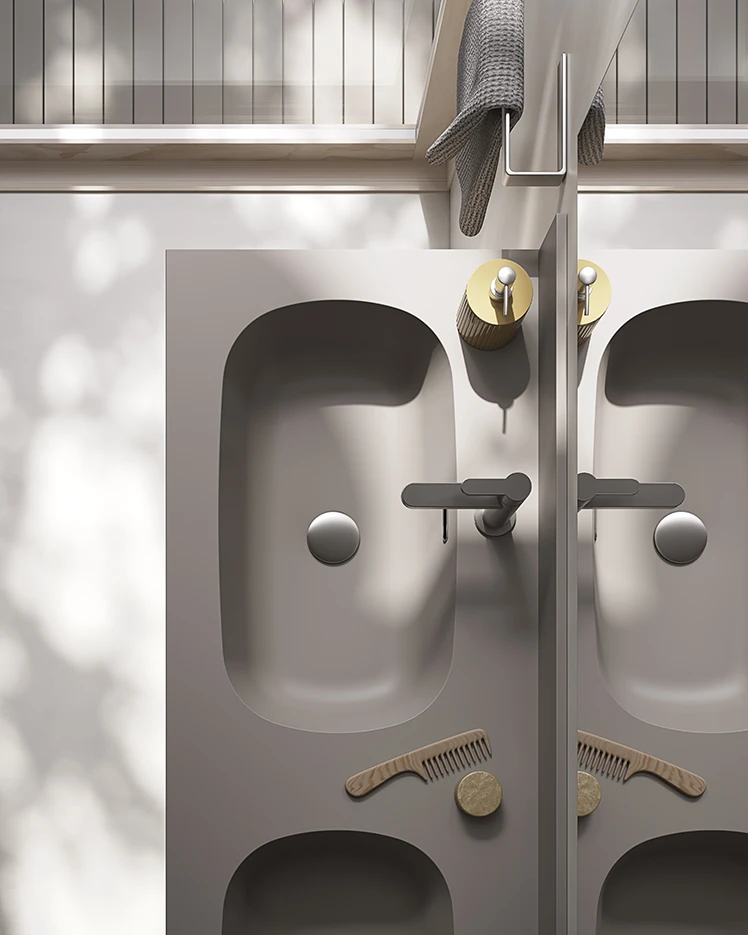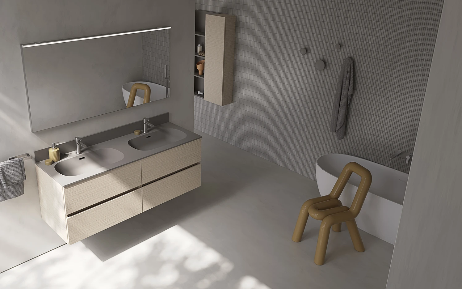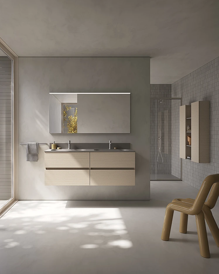 Componibile da bagno con doppia base lavabo, con doppio cassetto in Nobilitato sospeso Finitura Kalahari Dune più elegante Top Bent con doppia vasca integrata Finitura Fango Opaco più pensile con Boiserie integrata Laccato Fango Opaco, che richiama il colore del Top Bent con doppia vasca, più ampia specchiera con profilo in alluminio dona luce alla composizione.